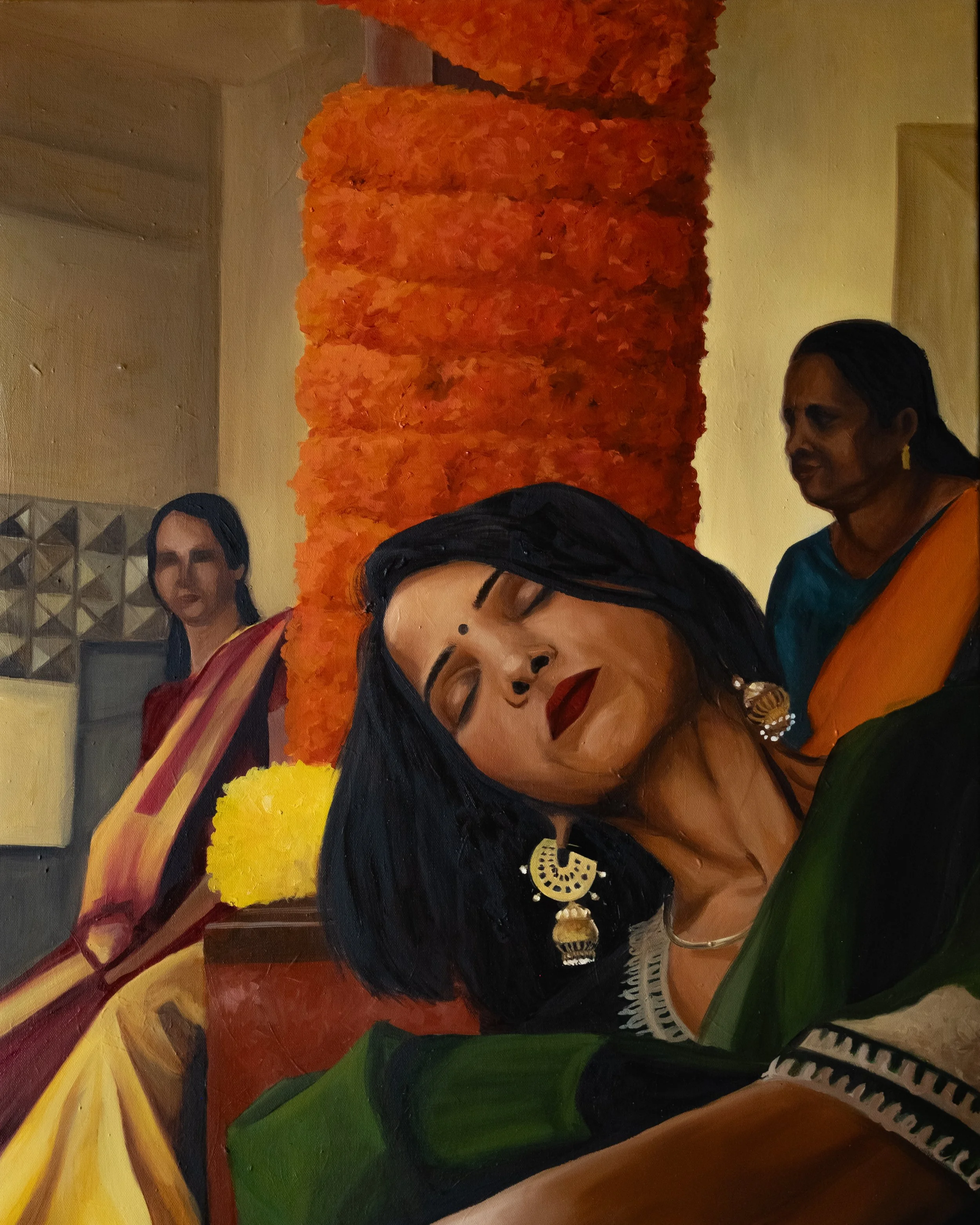 “The Youngest Daughter”“19.75 x 37.75 x 2”Oil paint, acrylic paint, on canvas. Framed in mahogany wood.2025$1,700
